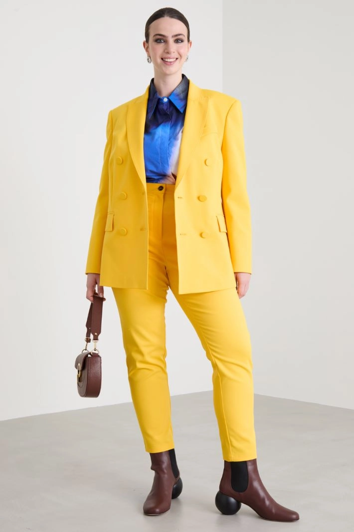 Fitted blazer in stretch cotton blend canvas, with matching polka dot trim, lapel collar, long sleeves with covered buttons and double-welt side pockets with flap. Center vent on the back and double-breasted fastening with buttons. Lined.