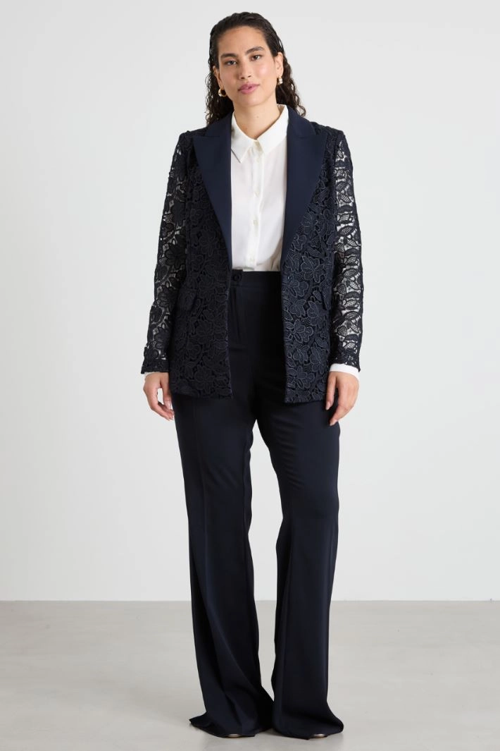 Straight-cut blazer in lamé lace, with peak lapel collar, long sleeves and patch pockets. Concealed snap button fastening. Lined.