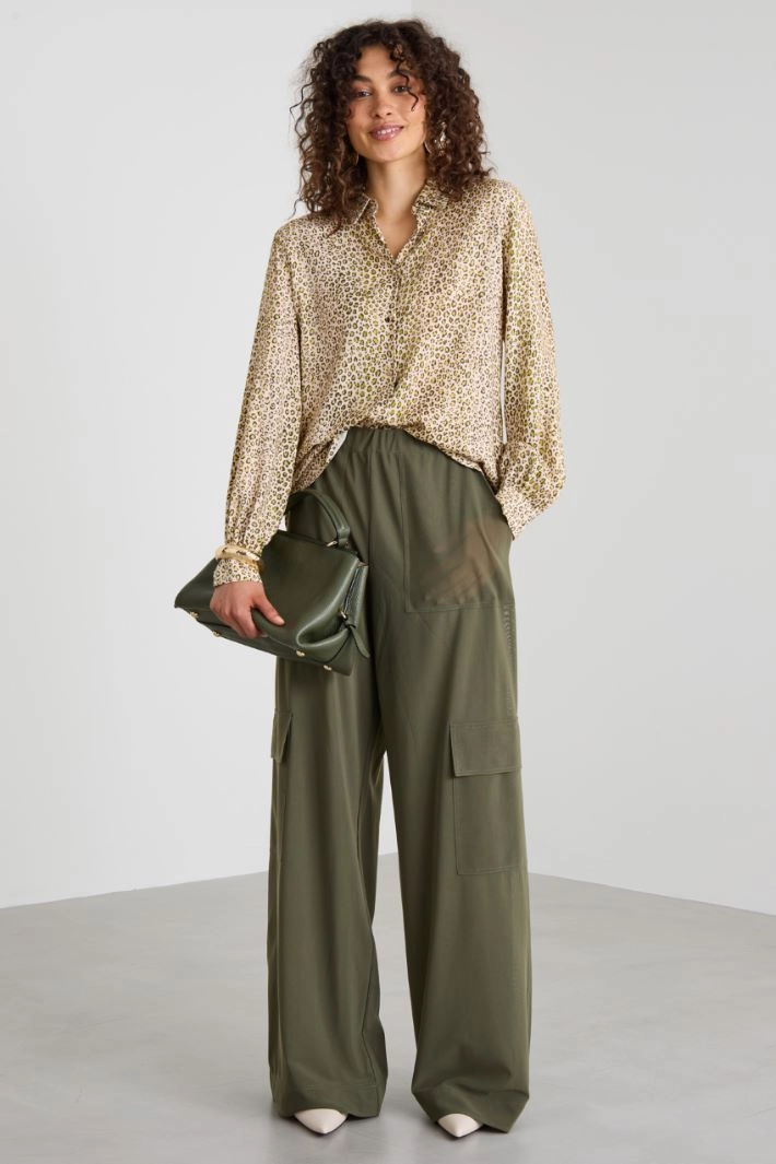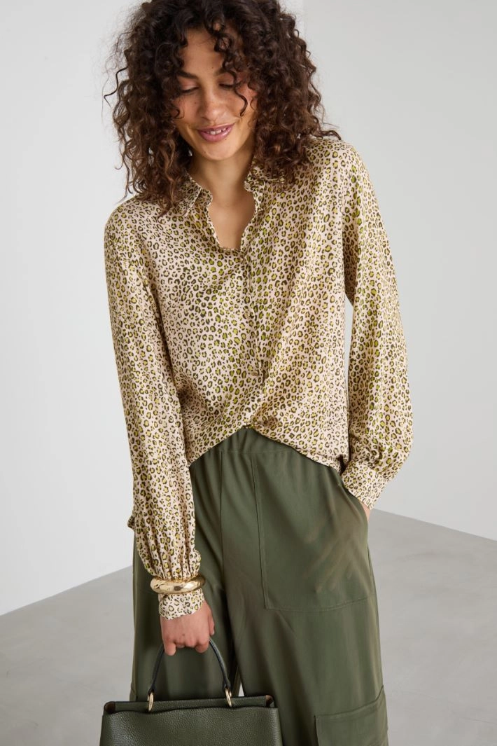 Straight-cut shirt in printed viscose twill, with a classic collar, long sleeves with buttoned cuffs, and a gathered back yoke. Fastened with jewel buttons.