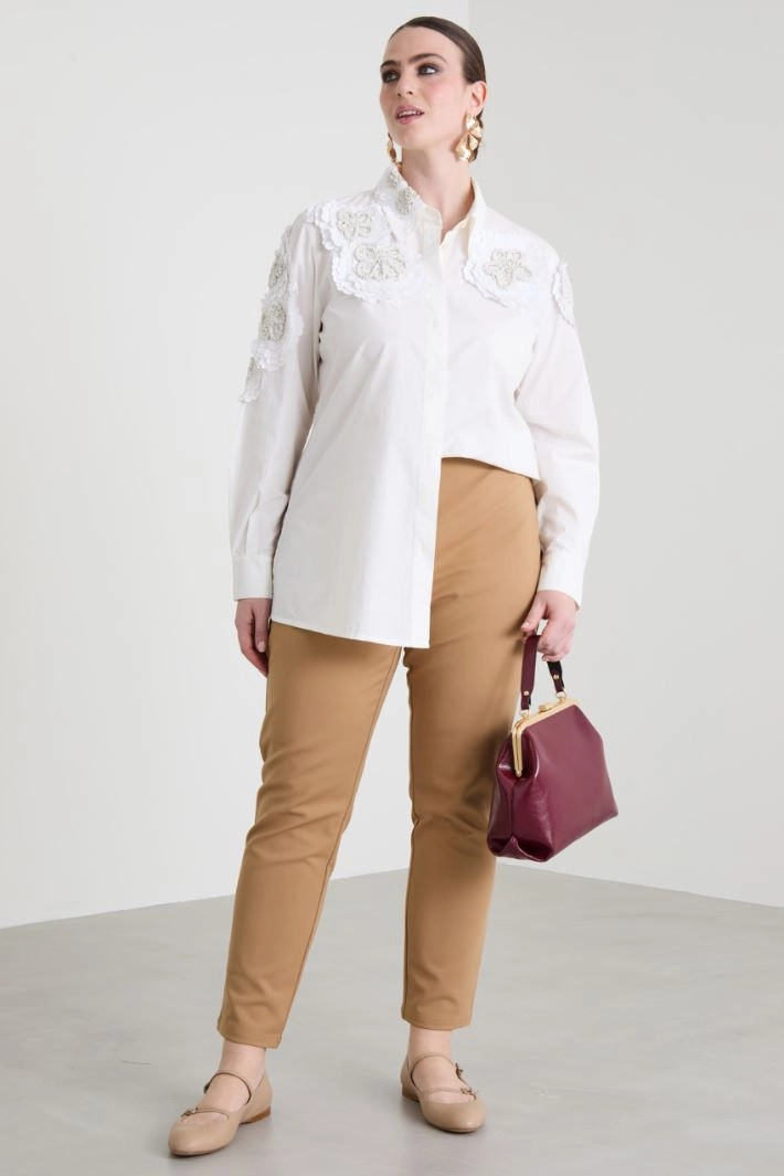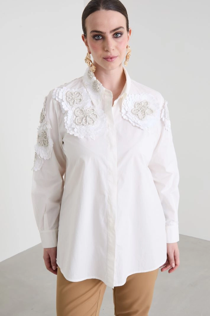Straight-cut shirt in pure cotton poplin, with matching embroidered motifs, classic collar, long sleeves with cuffs and buttons, and side slits. Hidden button fastening.