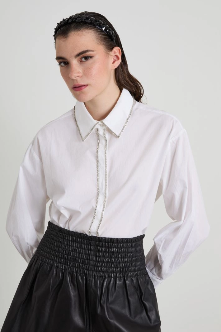 Straight-cut shirt in cotton poplin with rhinestones applied on the front, classic collar, long sleeves with cuff and buttons. Fastening with hidden buttons.
