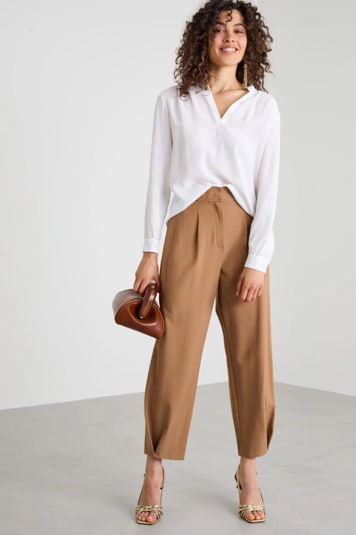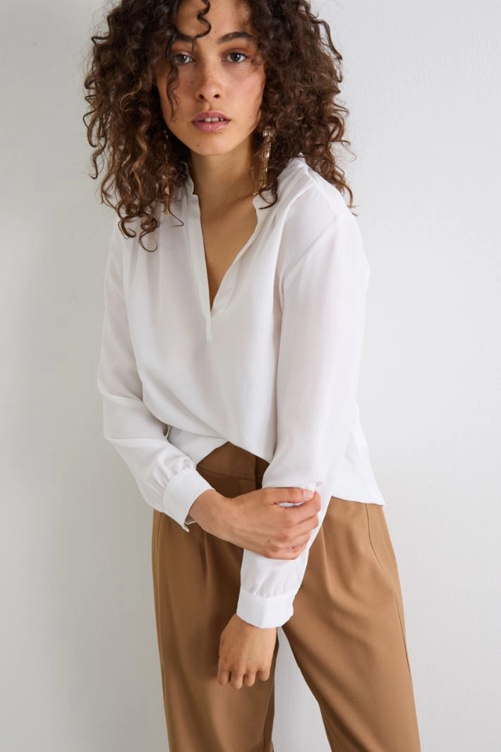 Loose-fit blouse in silk blend crepe de chine, with stand-up collar and V-neckline, long sleeves with cuffs and button, and yoke with box pleat on the back.