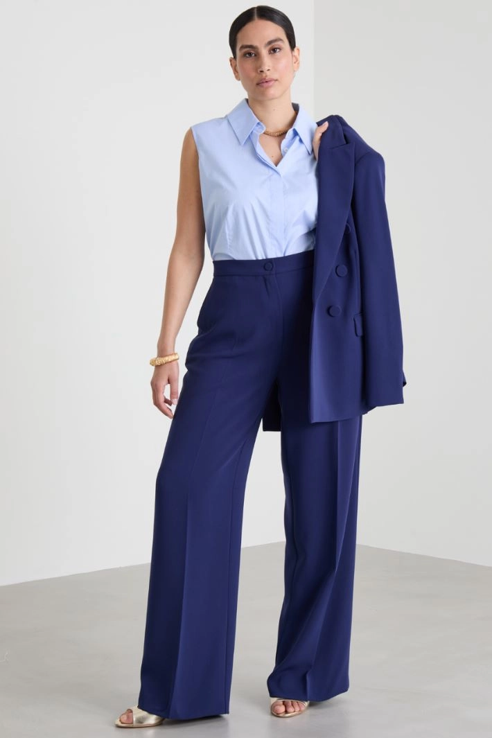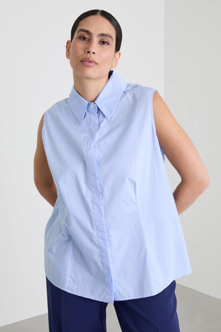 Straight-cut sleeveless shirt in pure cotton poplin, with classic collar and hidden button fastening.