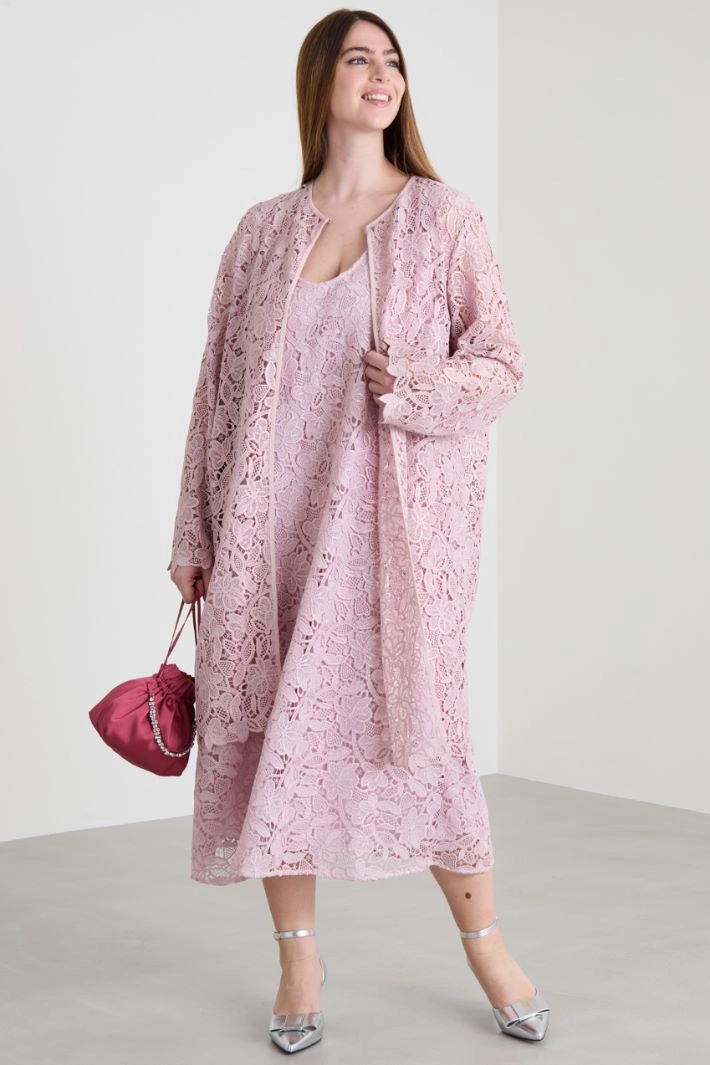 Straight-cut duster coat in lamé lace, with round neckline, long sleeves and hook fastening.