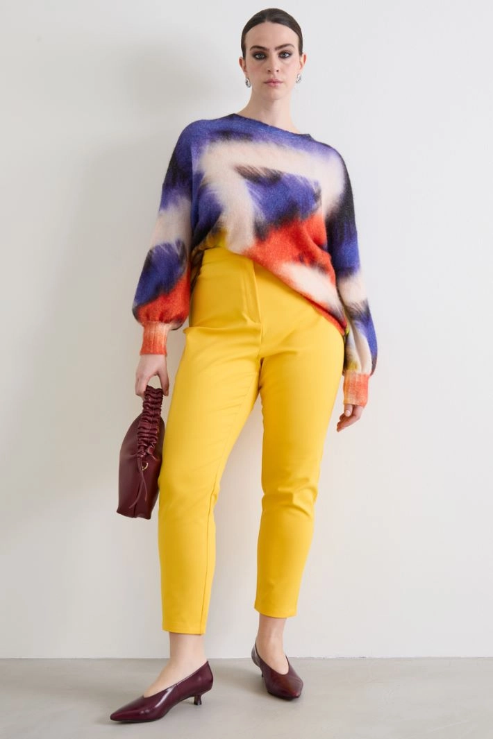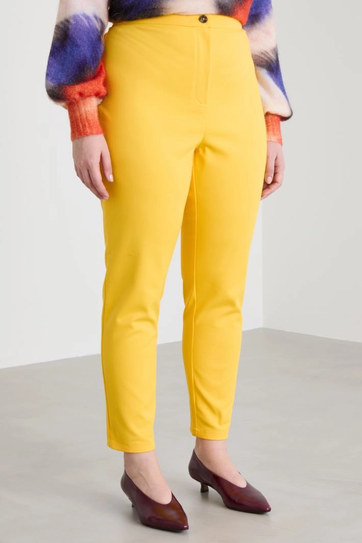 Slim-fit trousers in stretch cotton blend canvas, with elasticated waistband at the back and fastening with hidden zip and button.