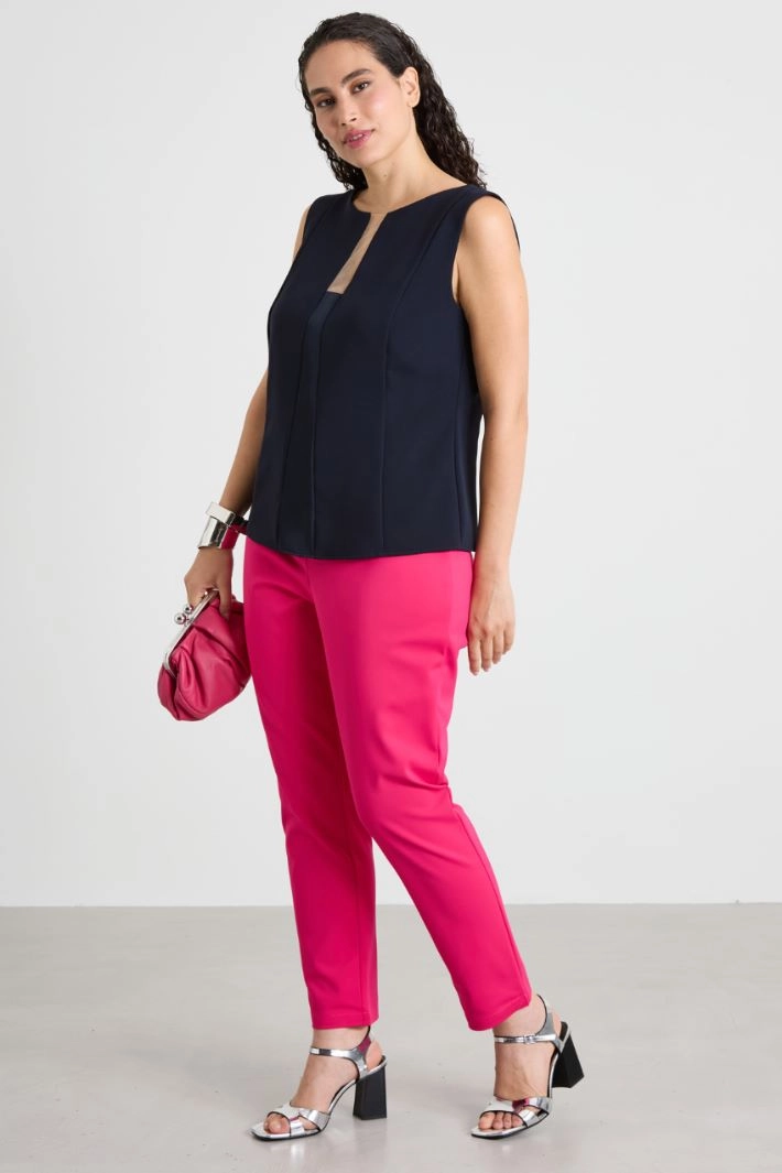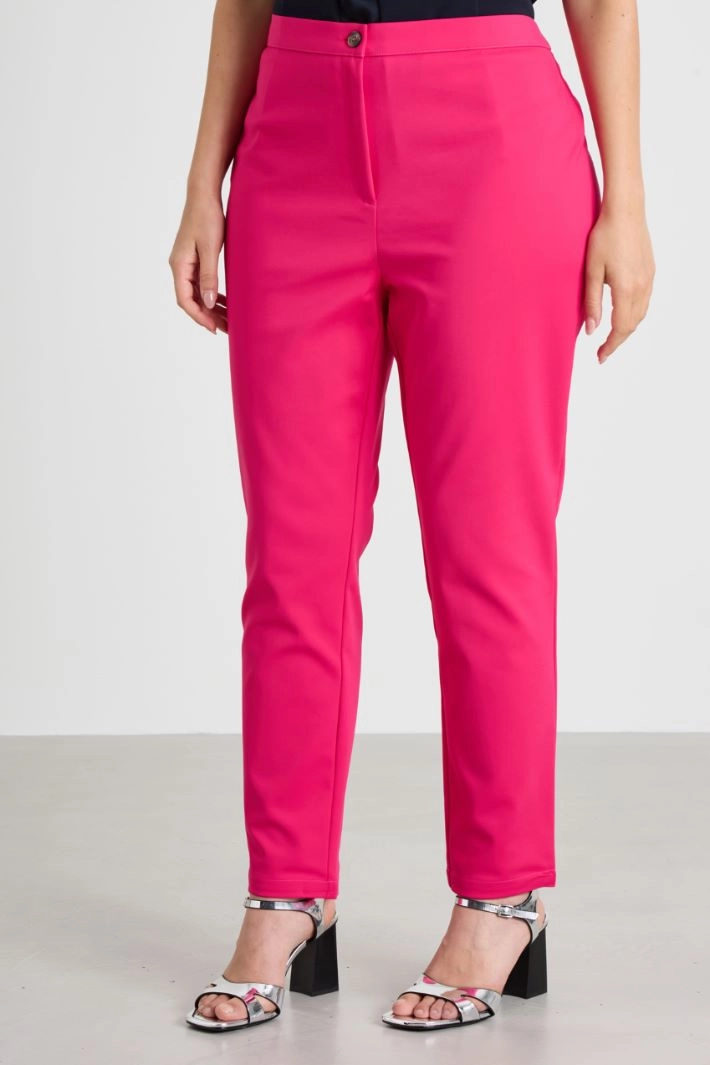 Slim-fit trousers in stretch cotton blend canvas, with elasticated waistband at the back and fastening with hidden zip and button.