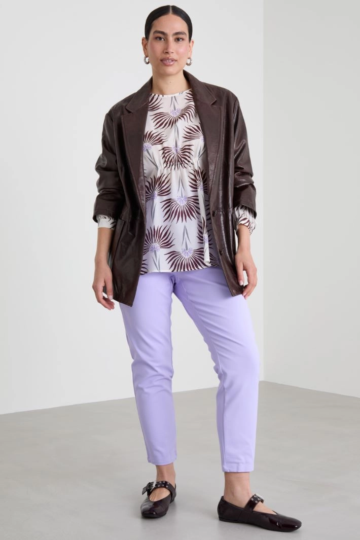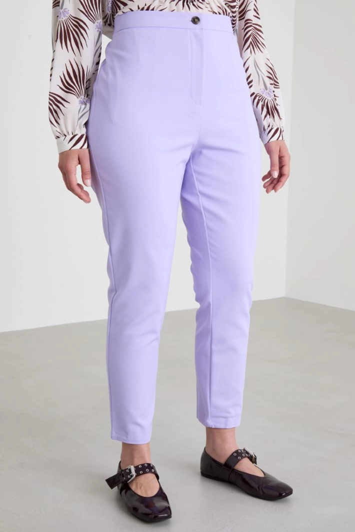 Slim-fit trousers in stretch cotton blend canvas, with elasticated waistband at the back and fastening with hidden zip and button.