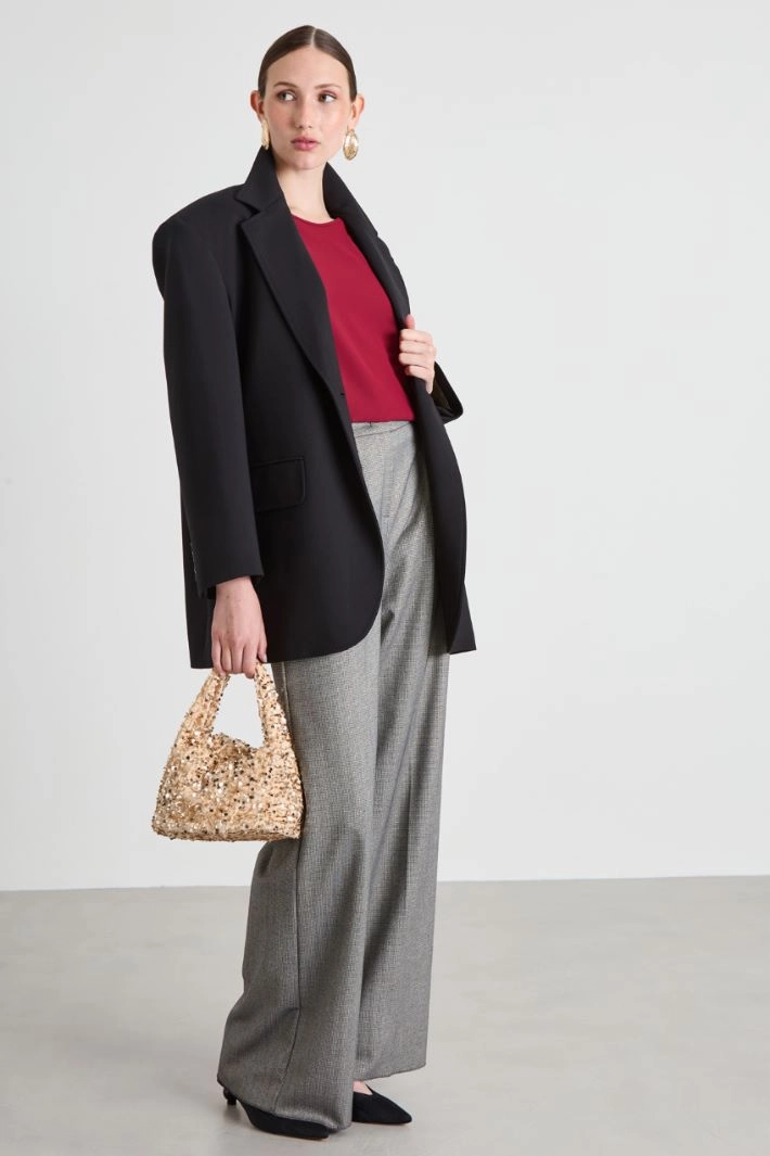 Straight and wide-leg trousers in viscose blend lamé houndstooth fabric with micro sequins, belt loops at the waist, pleats, French pockets at the front, single welt pocket at the back and pressed crease along the length. Hidden fastening with zip, button and hooks.