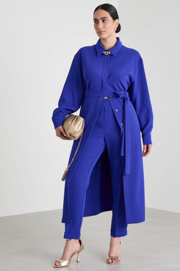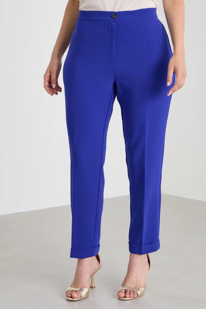 Slim-fit cady trousers with elastic waistband insert on the back, pressed crease and hem with cuff. Fastening with hidden zip and button.