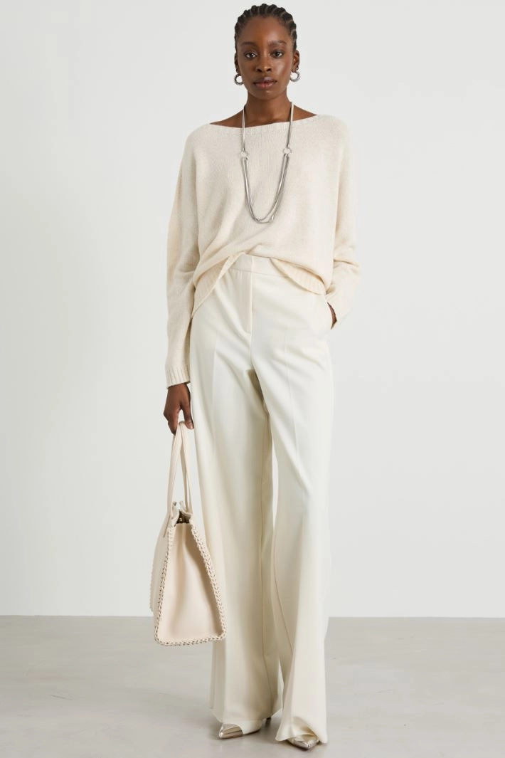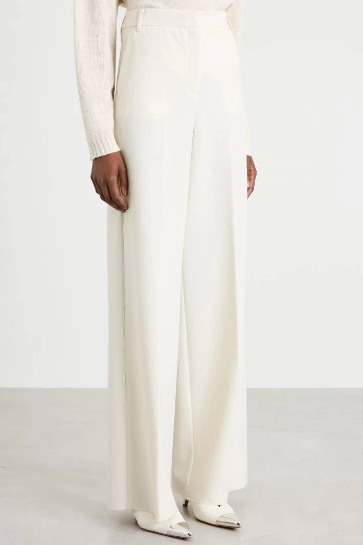 Palazzo trousers in stretch viscose blend batavia, with belt loops at the waist, side French pockets and welt flap at the back, crease pressed lengthwise and hidden fastening with zip, button and hook.