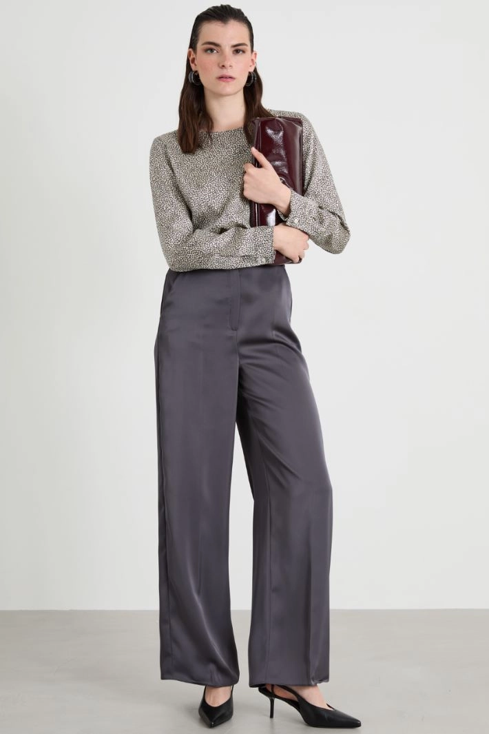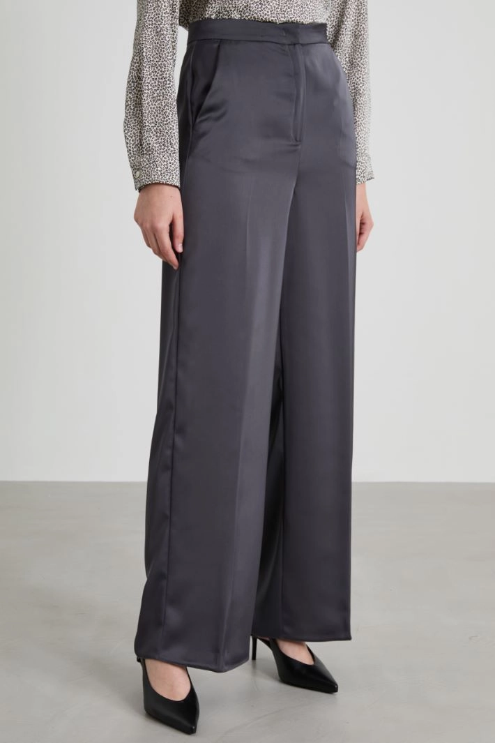 Satin palazzo trousers with side French pockets, crease along the length and hidden fastening with zip, button and hook.