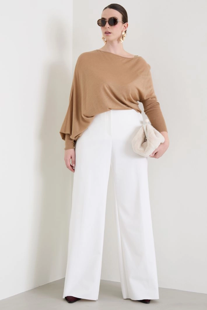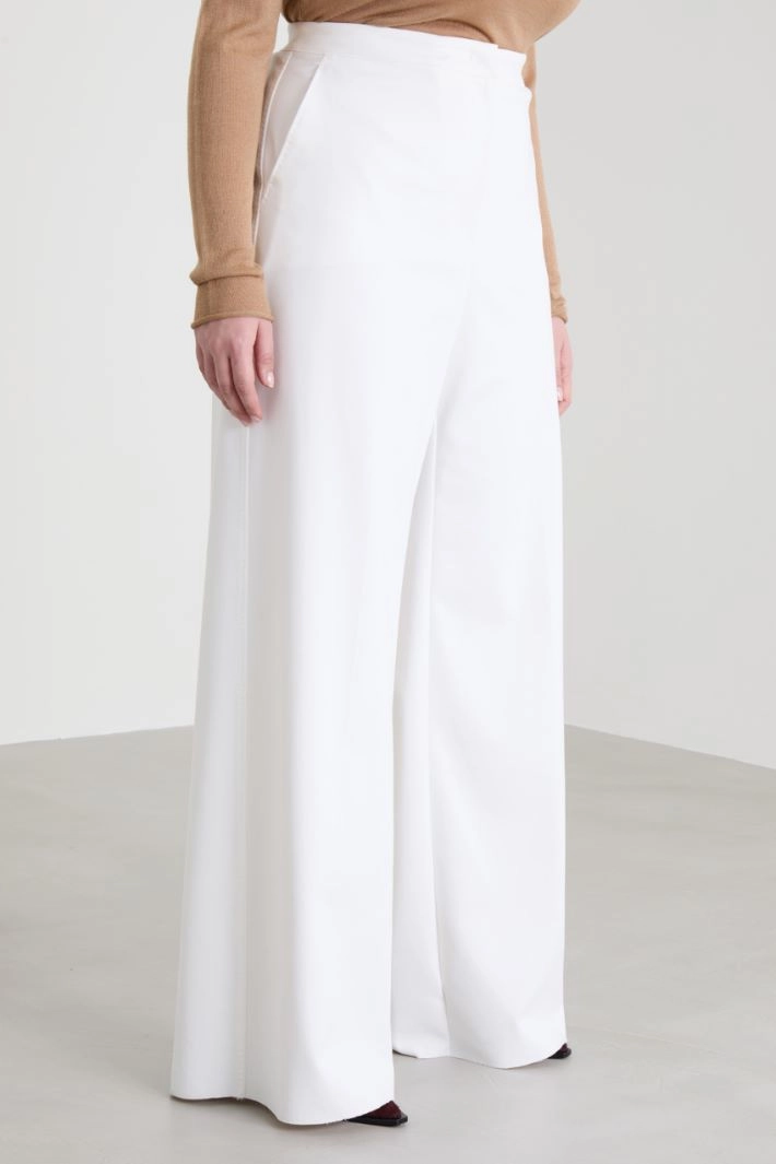 Palazzo trousers in stretch cotton blend canvas, with topstitching, side French pockets, crease along the length and hidden fastening with zip, button and hook.