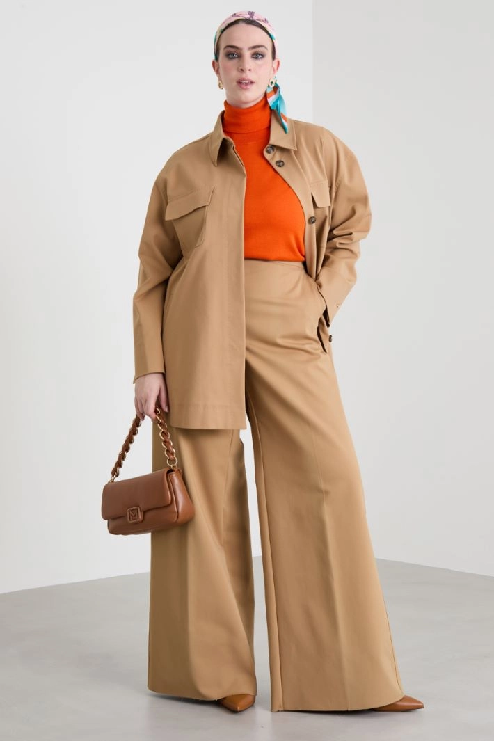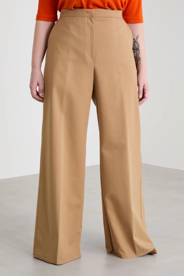Palazzo trousers in stretch cotton blend canvas, with topstitching, side French pockets, crease along the length and hidden fastening with zip, button and hook.