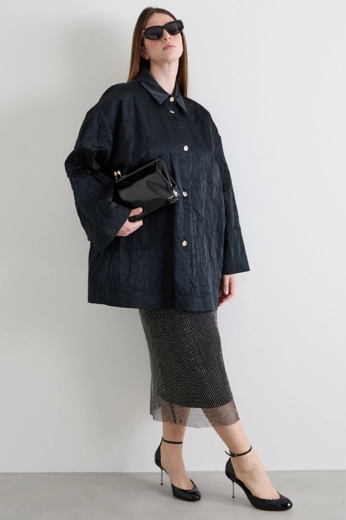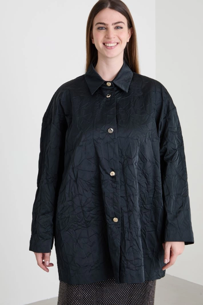 Oversized straight-fit tunic in crumpled duchesse, shirt collar, long sleeves and pockets sewn into the sides. Button fastening.