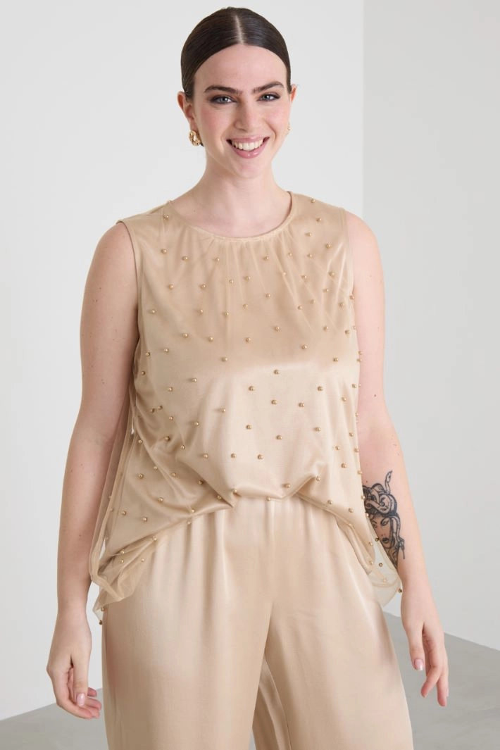 Flared tulle top with all-over embroidered beading and round neckline. Teardrop fastening with button. Lined.