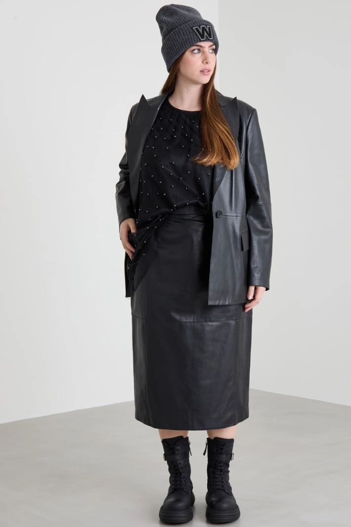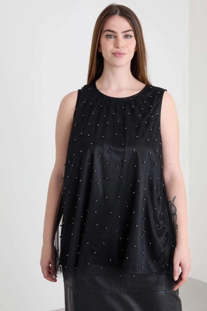 Flared tulle top with all-over embroidered beading and round neckline. Teardrop fastening with button. Lined.