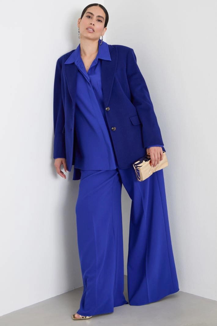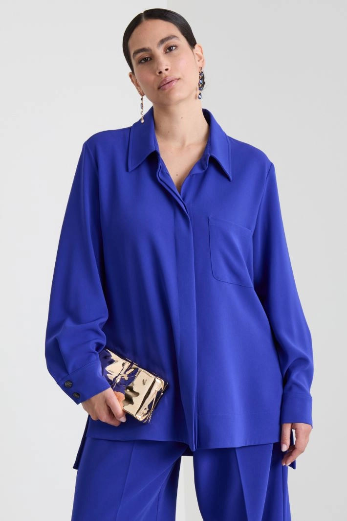 Straight-cut cady shirt with classic collar, long sleeves with cuffs and buttons, chest pocket and side slits. Hidden button fastening.