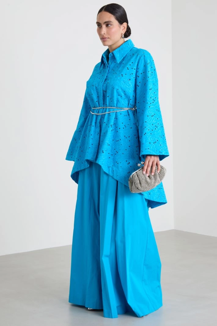Asymmetrical flared-line tunic in cotton-blend poplin, with broderie anglaise motif, shirt collar, long sleeves and hidden button fastening.