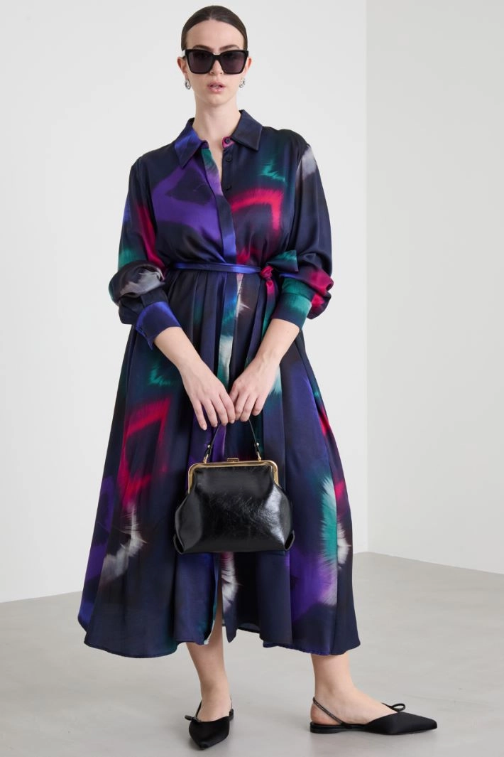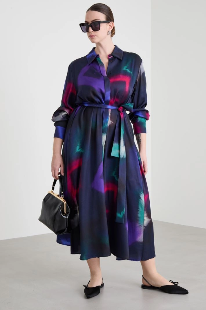 Flowing shirt dress in pure viscose twill, with shirt collar, long sleeves with cuffs and buttons, side pockets inset in the seam and hidden fastening with buttons. Matching sash.
