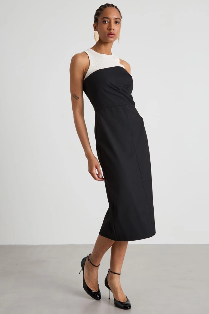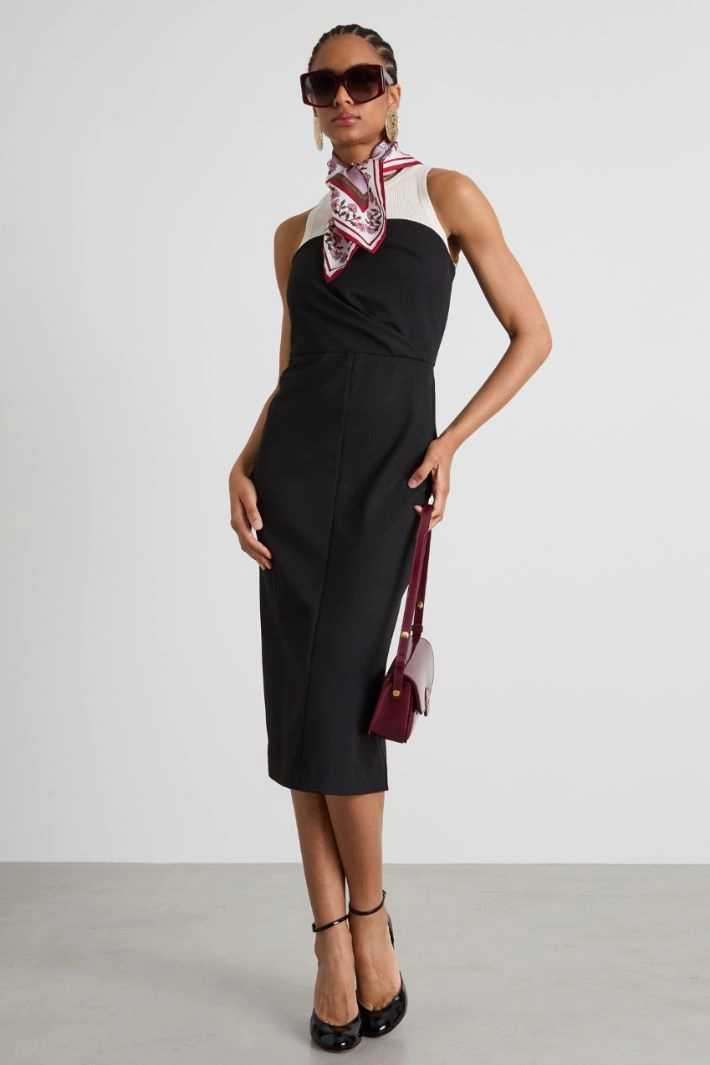 Semi-fitted sheath dress in stretch gabardine, with a straight neckline and pleated motif, slit and invisible zip fastening at the centre back.
