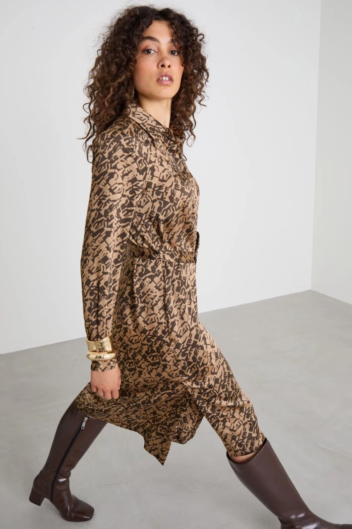 Straight-cut shirt dress in printed twill, with shirt collar, long sleeves with cuffs and buttons, inset pockets on the sides, yoke with box pleat on the back and side slits at the bottom of the garment. Matching belt. Fastening with hidden buttons.