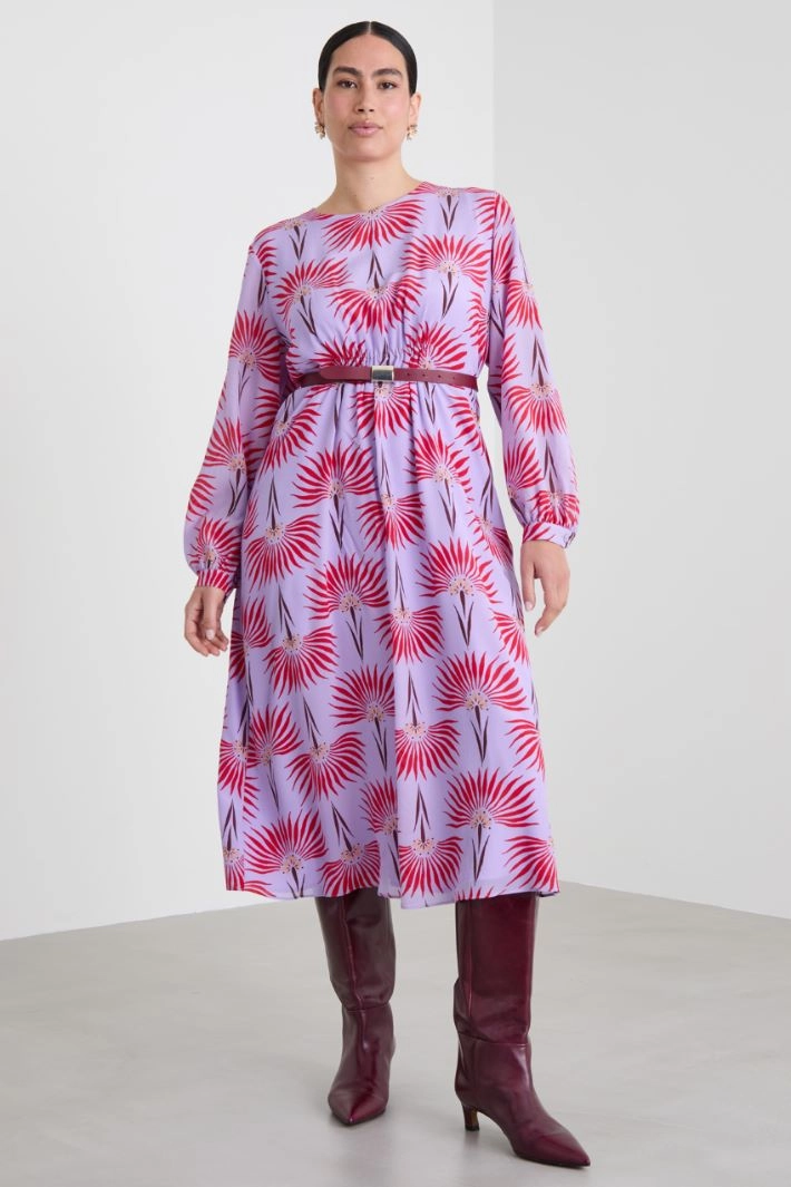 Flared midi dress in printed pure silk crepe de chine, with a crew neck, long sleeves with thin cuff and button, gathered motif with elastic insert on the front and fastening with invisible zip on the back. Partially lined.