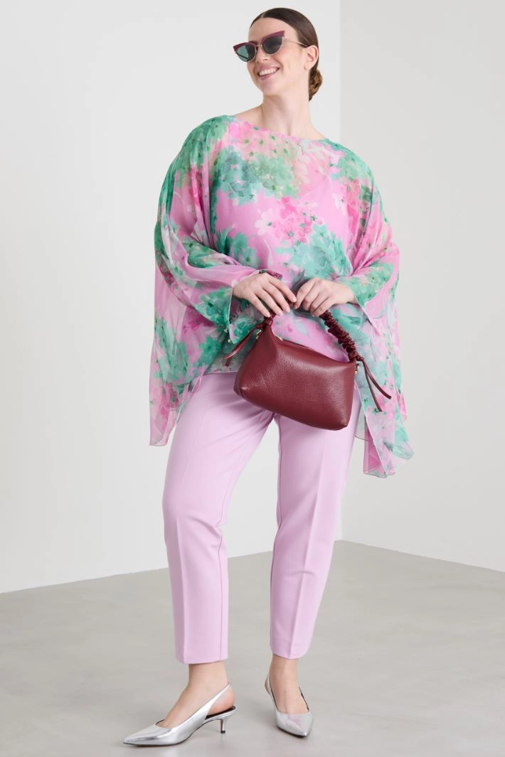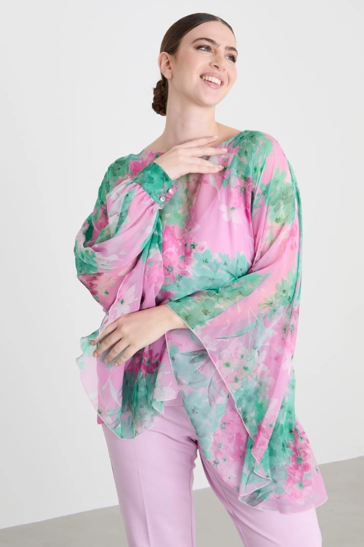Flowing tunic in printed pure silk georgette, with a boat neckline and long kimono sleeves. Matching slip top.