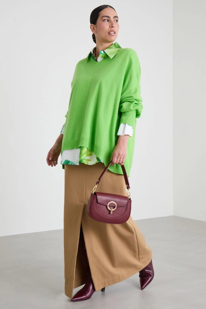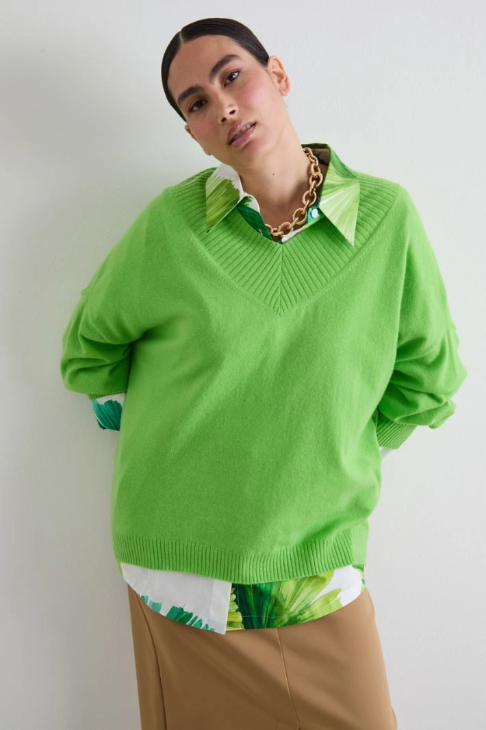 Flared sweater in pure cashmere yarn, with V-neck, long sleeves with dropped shoulders. Ribbed trim.