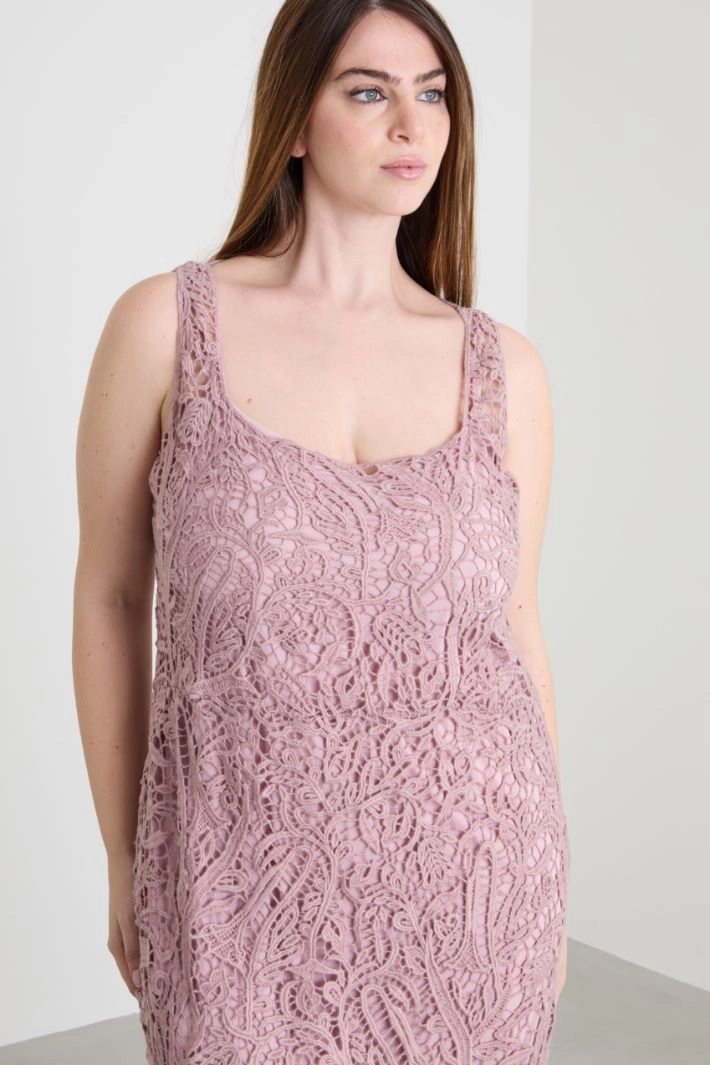 Semi-fitted dress in wool-blend lace, with square neckline and matching slip.