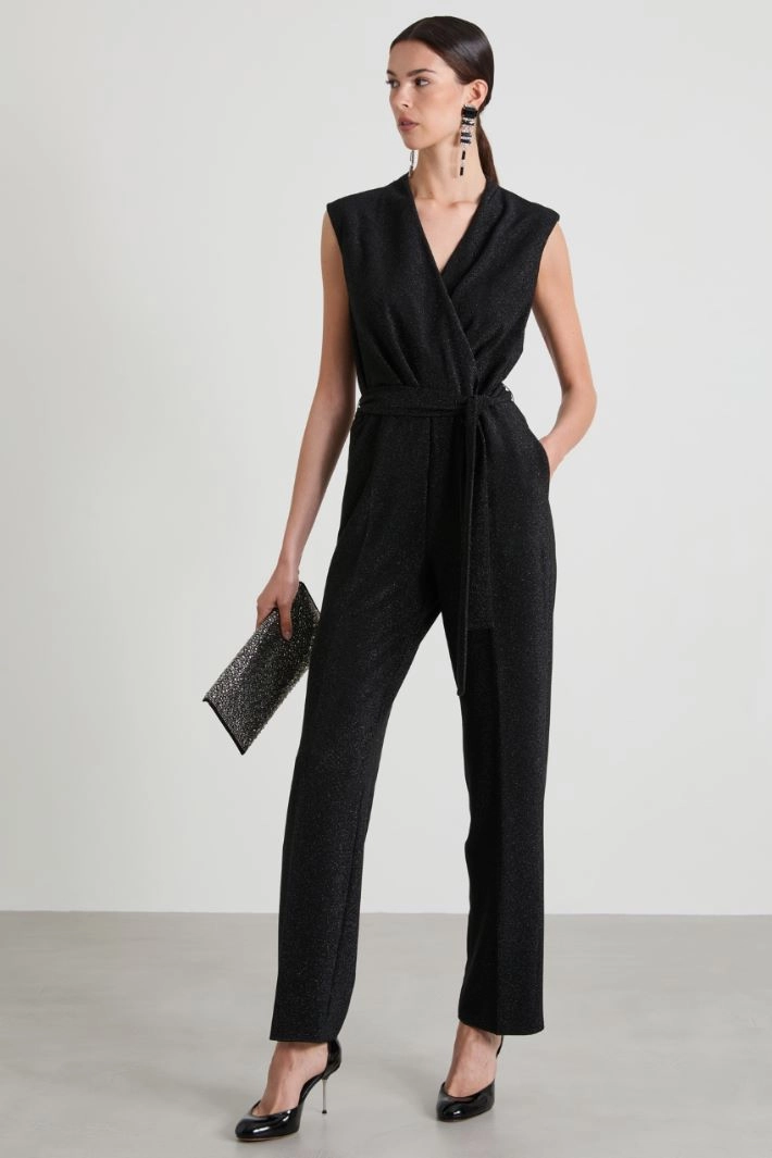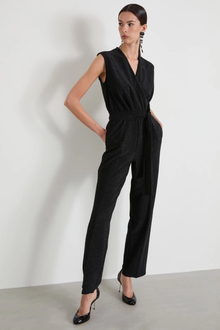 Semi-fitted jumpsuit in lamé jersey, with a crossover V-neckline, inset side pockets, gathered waist and matching belt. Invisible zip fastening on the back. Lined.