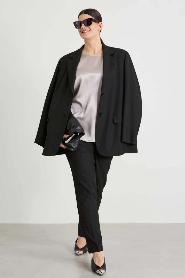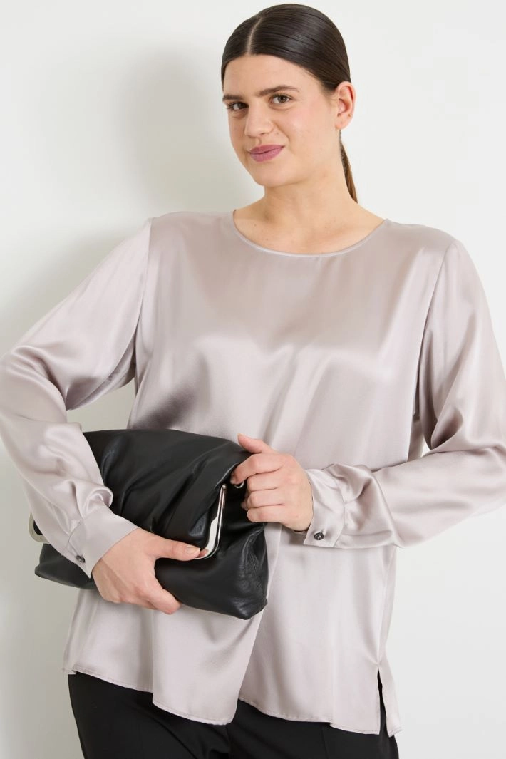 Flowing blouse in pure silk satin, with round neckline and long sleeves with cuff and button.
