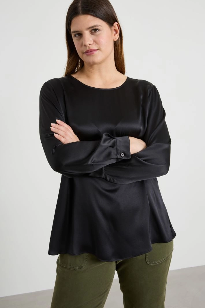 Flowing blouse in pure silk satin, with round neckline and long sleeves with cuff and button.