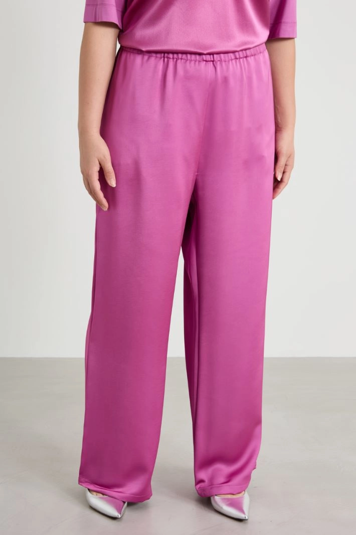 Flowing satin trousers with elasticated waistband and inset side pockets.