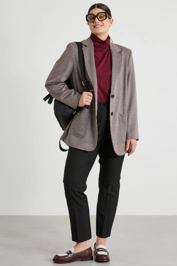 Straight-cut trousers in stretch viscose blend twill, with elastic waistband insert on the back and pressed crease lengthwise. Zip and button fastening.