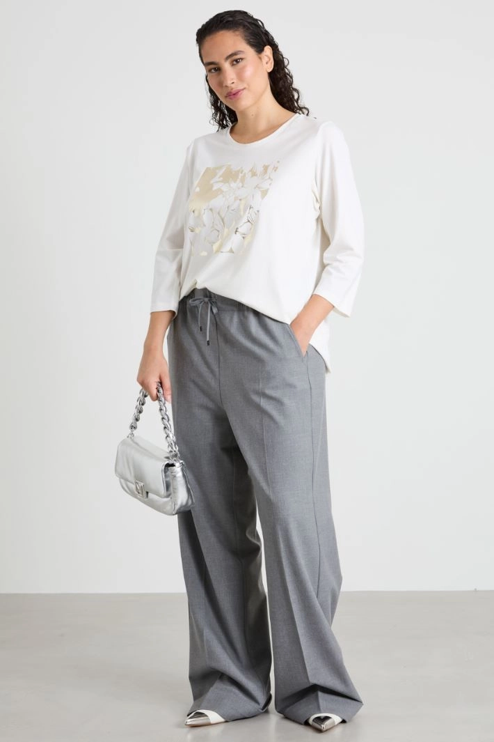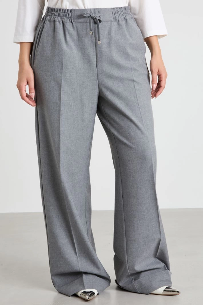 Straight, wide-leg trousers in stretch viscose blend twill, with elastic insert and drawstring at the waist, French pockets, crease pressed lengthwise and turn-up at the hem.