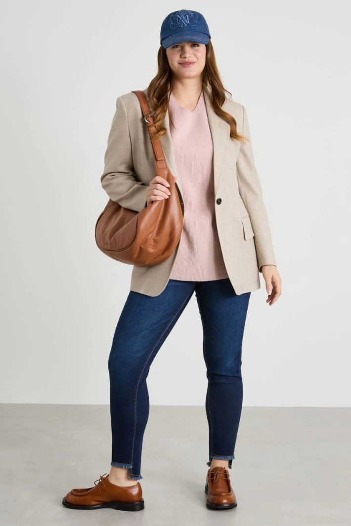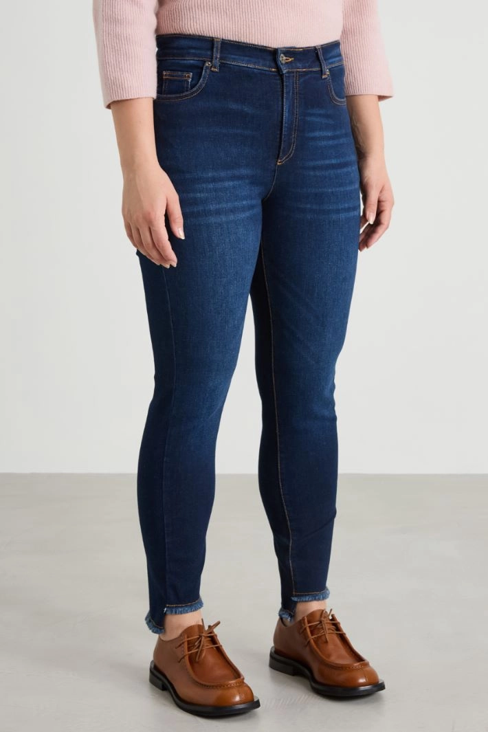 Skinny jeans in stretch cotton denim, with belt loops, five pockets, asymmetric hem and zip and metal button fastening.