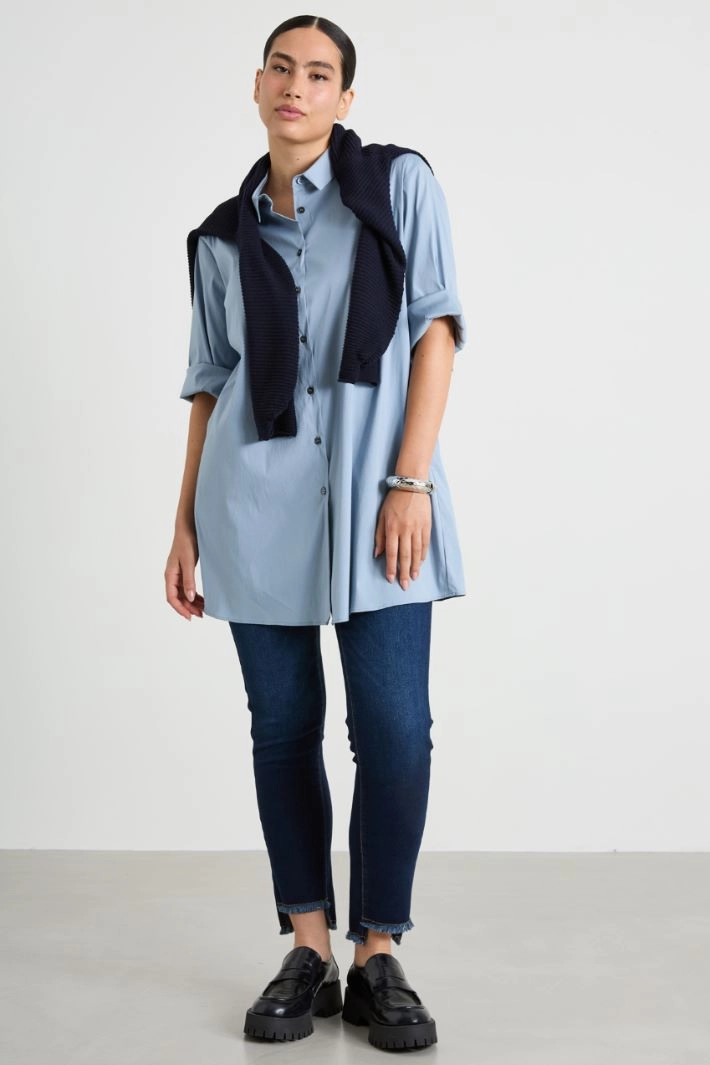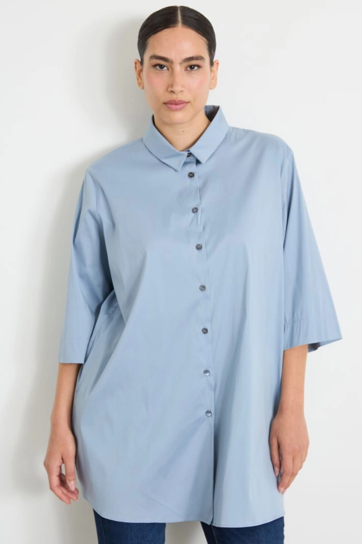 Straight-cut shirt in stretch cotton poplin, with classic collar, three-quarter sleeves and inset pockets. Button fastening.