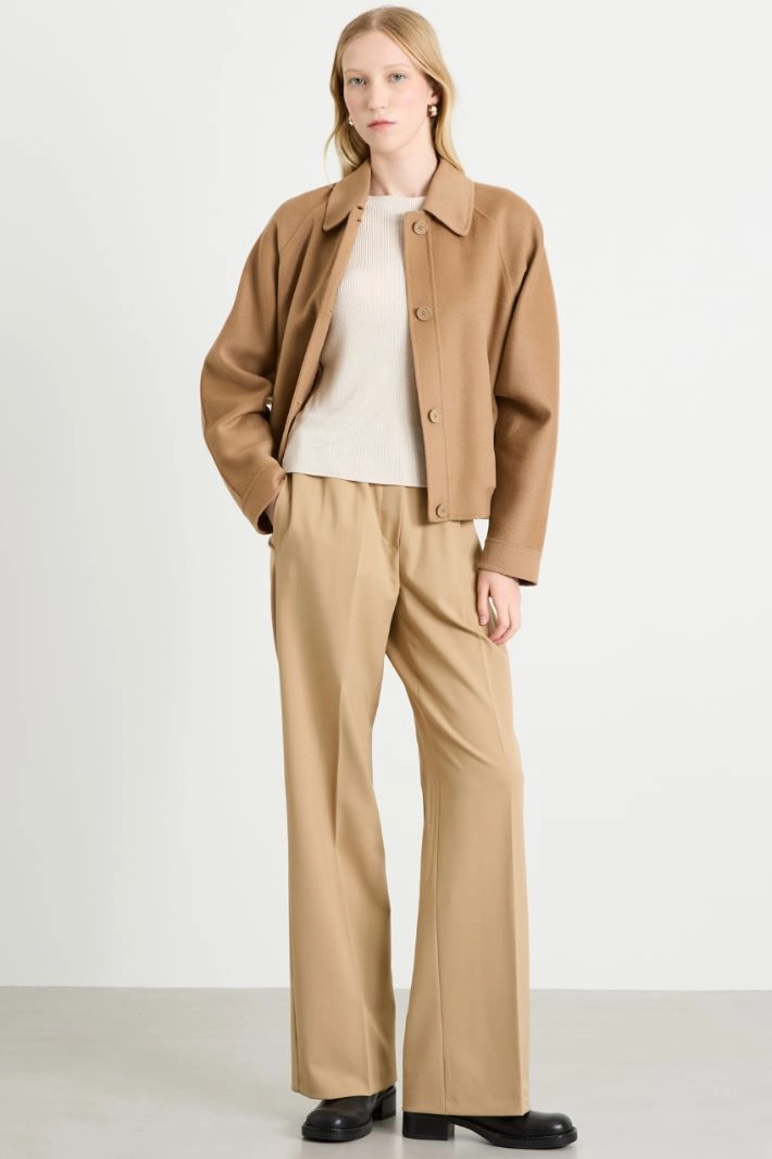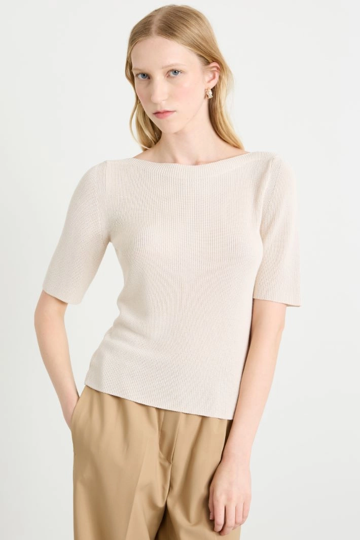 Slim-fit English rib sweater in viscose blend, with a boat neckline and short sleeves.