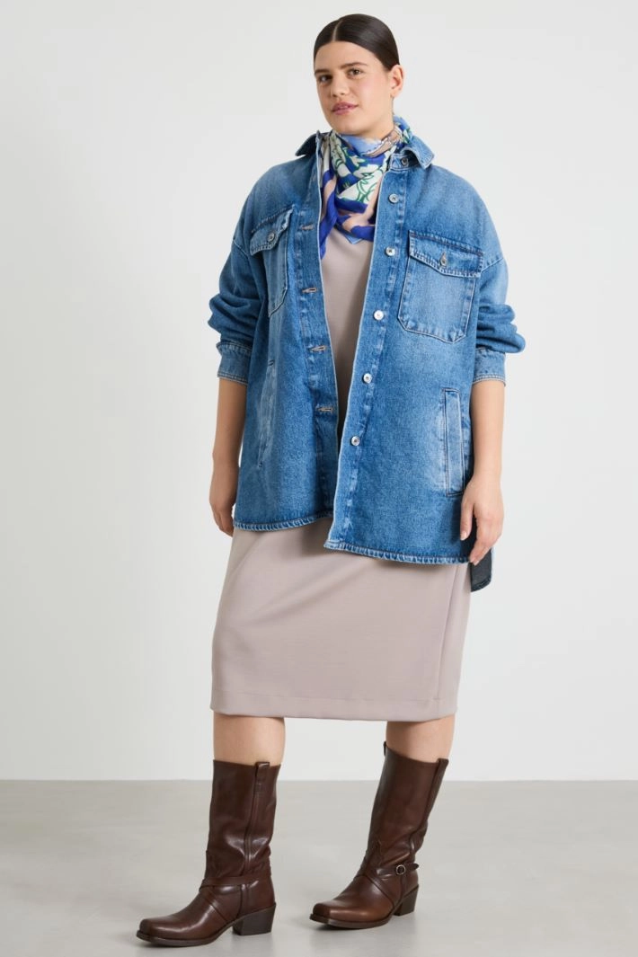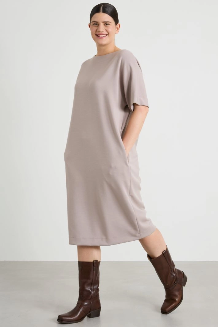 Loose-fitting dress in stretch viscose jersey, with crew neck, short kimono sleeves, inset side pockets and a yoke with a pleat motif on the back. Invisible zip fastening on the center back.