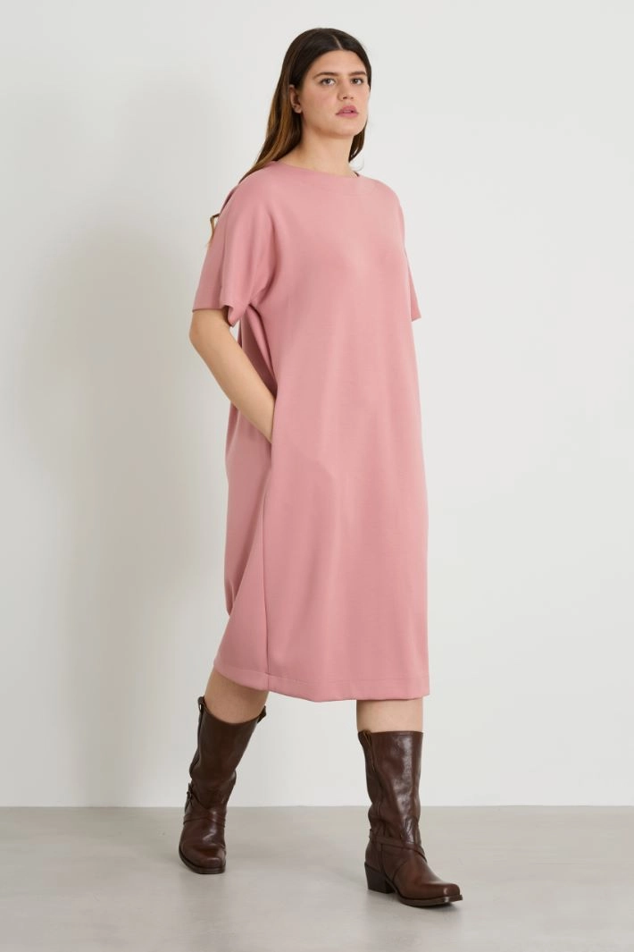 Loose-fitting dress in stretch viscose jersey, with crew neck, short kimono sleeves, inset side pockets and a yoke with a pleat motif on the back. Invisible zip fastening on the center back.