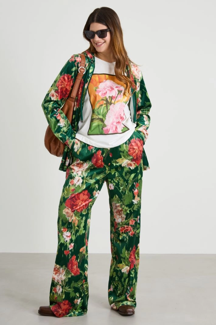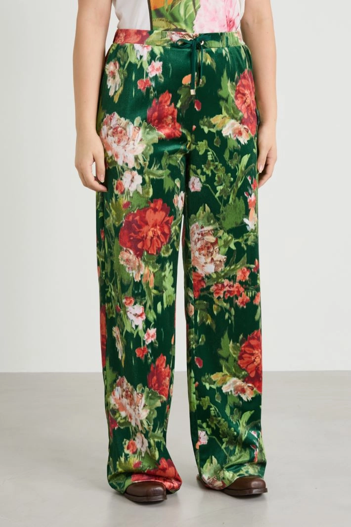 Straight-cut trousers in all-over printed stretch velvet, with elastic insert and drawstring at the waist, and French pockets.