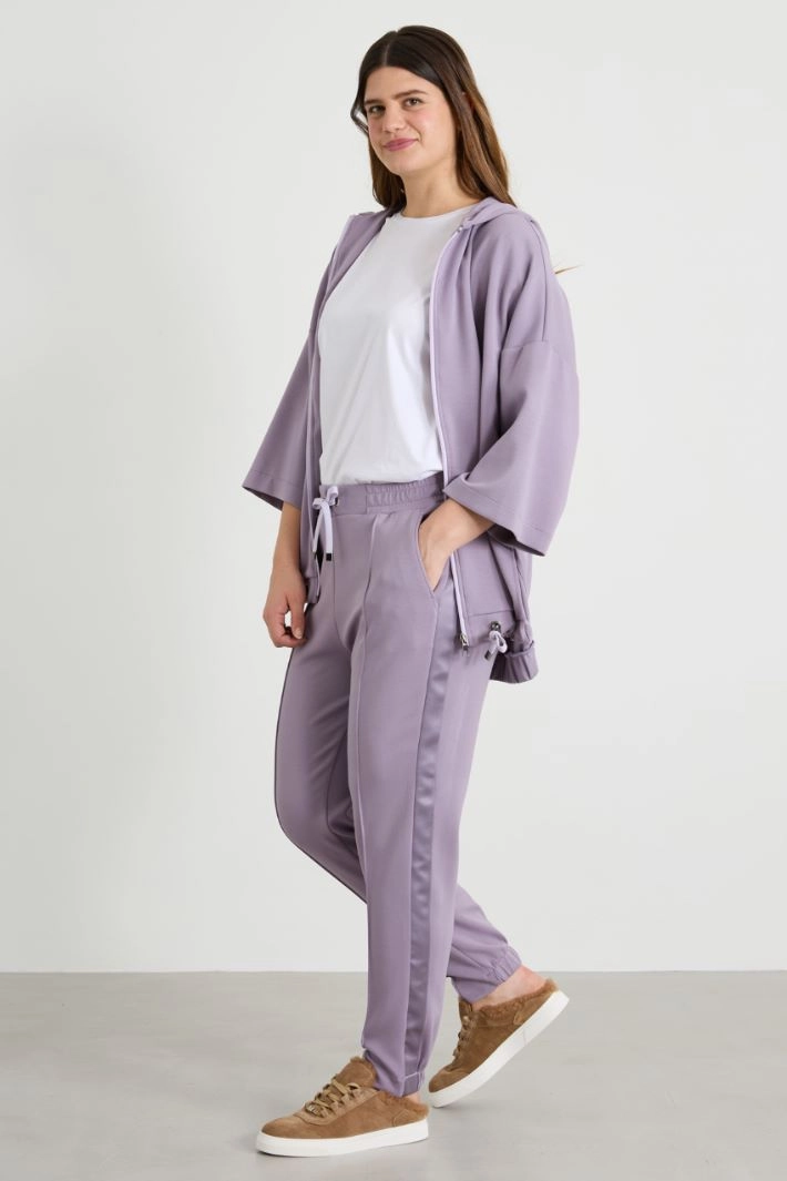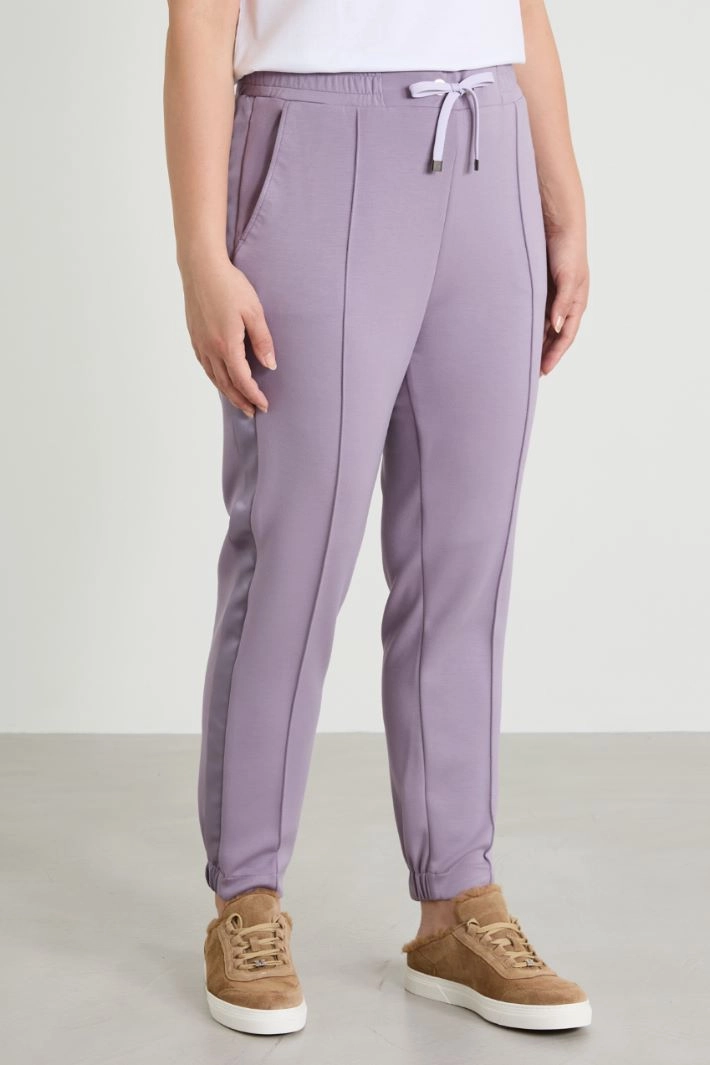 Jogger trousers in stretch viscose blend jersey, with drawstring waist, inset side pockets, side satin bands, pleat sewn along the length and ankle cuff.