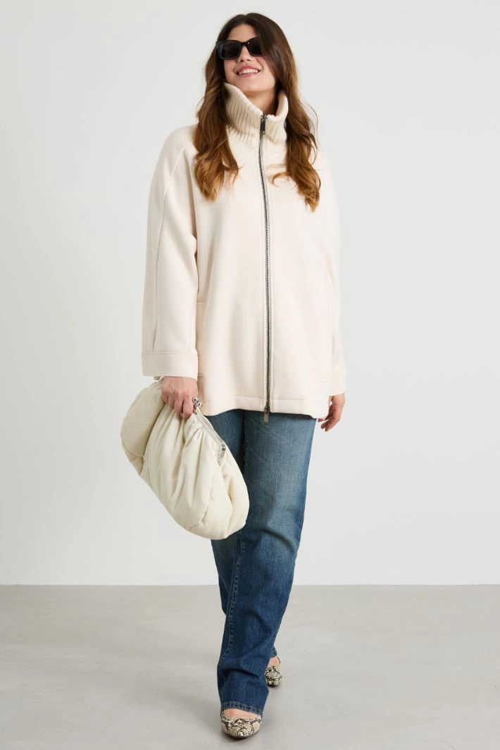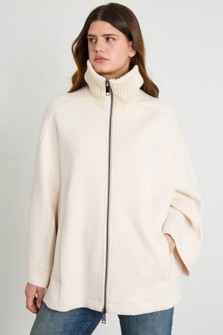 Straight-fit cape in heavy jersey with a high ribbed collar, long, wide kimono sleeves and welt pockets at the sides. Zip fastening.