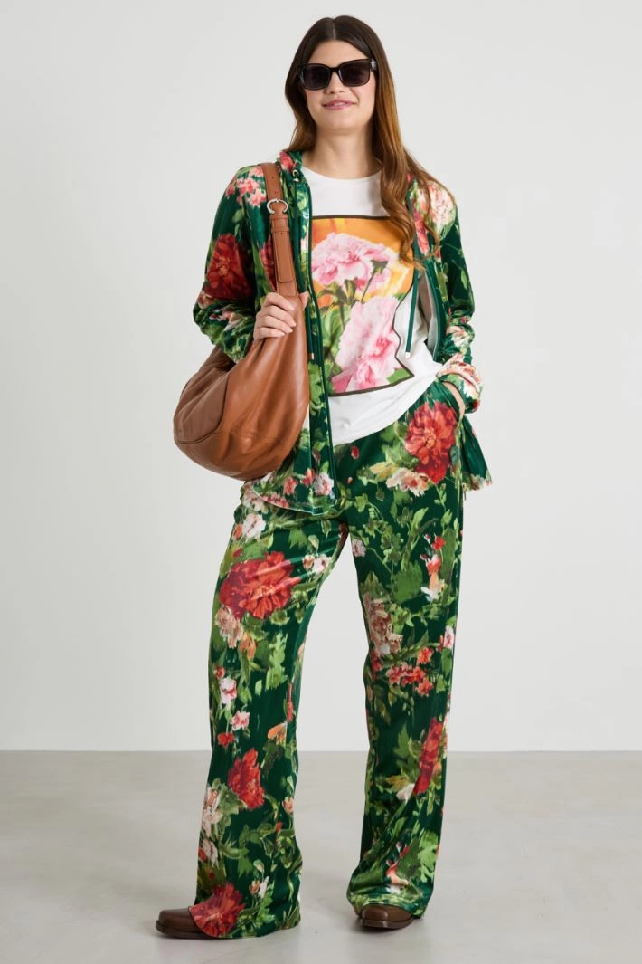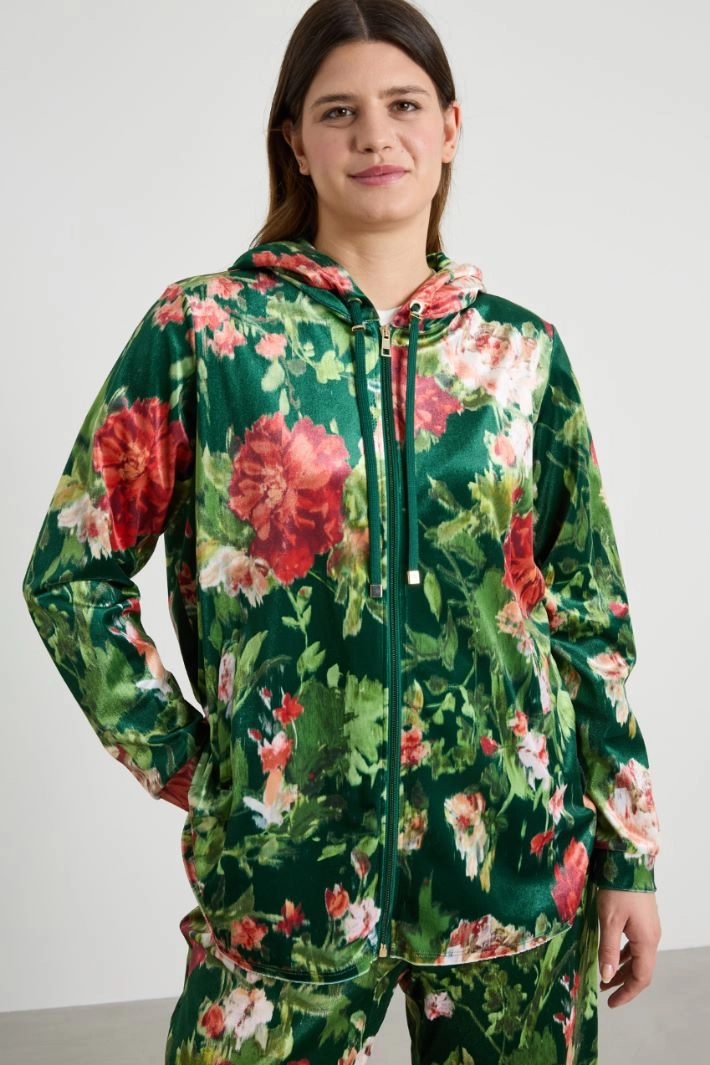 Flared sweatshirt in all-over printed stretch velvet, with hood and drawstring, long sleeves, welt pockets and asymmetrical hem. Zip fastening.