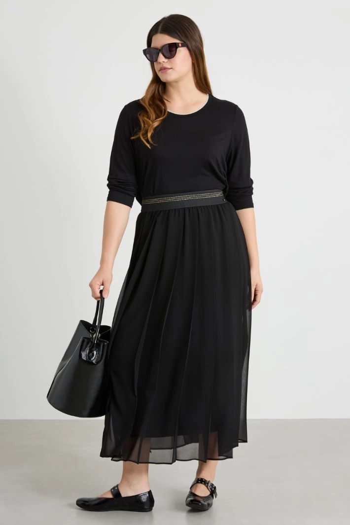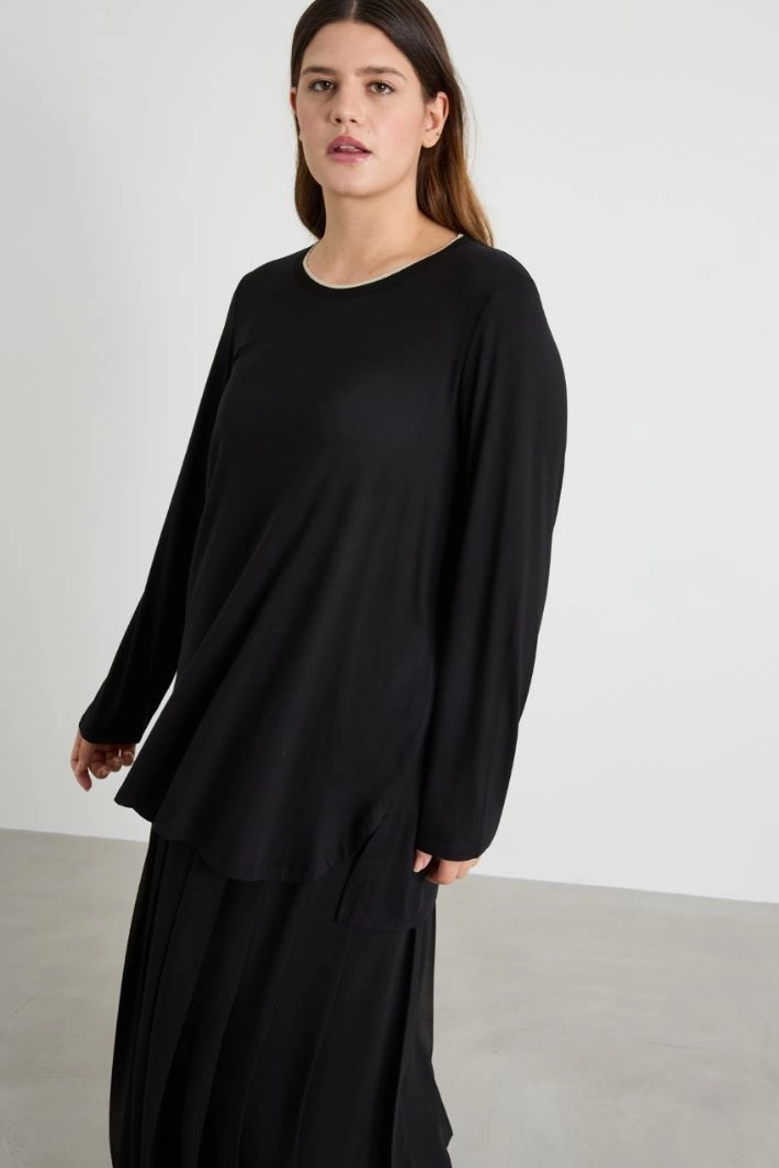 Straight-cut T-shirt in stretch viscose jersey, with rounded neckline, long sleeves and asymmetrical hem that is longer at the back.