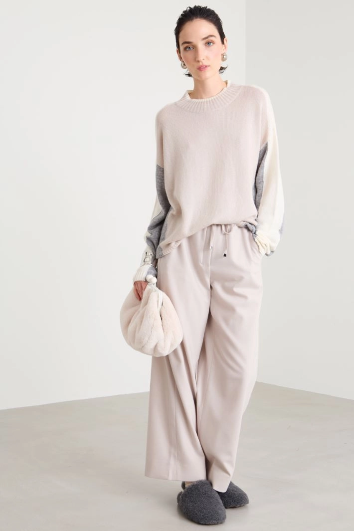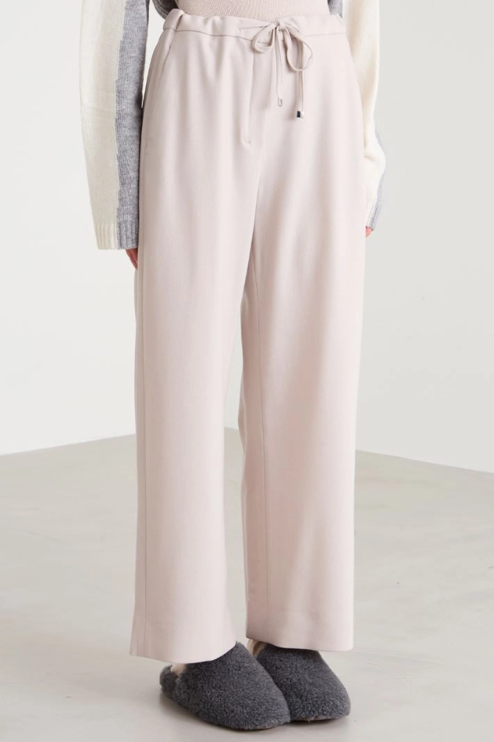 Loose-fit trousers in stretch wool flannel, with drawstring waist, side French pockets and hidden fastening with zip, button and hook.