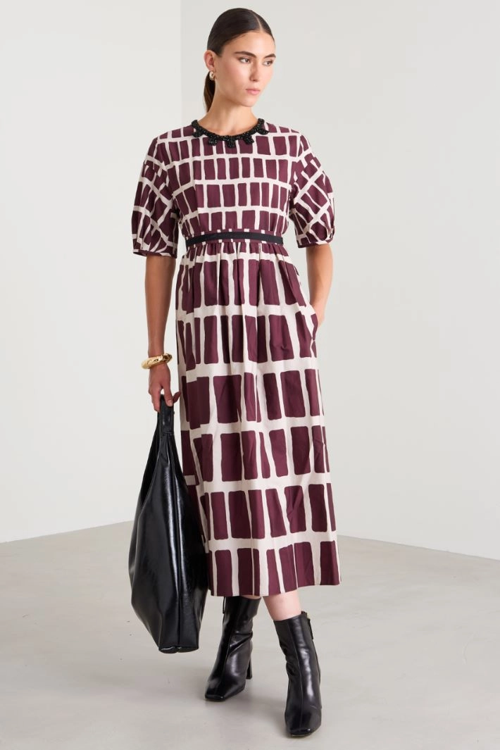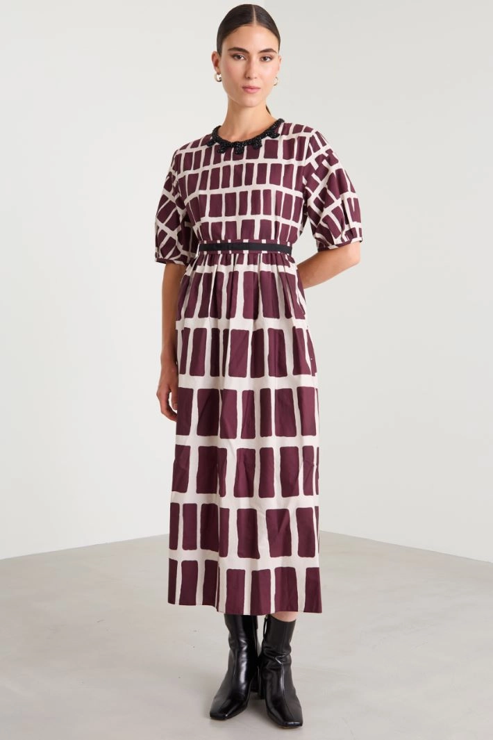 A-line dress in printed pure cotton poplin, with a crew neckline finished with removable rhinestones, short balloon sleeves, inset side pockets and fastening with an invisible zip on the back. Matching belt.