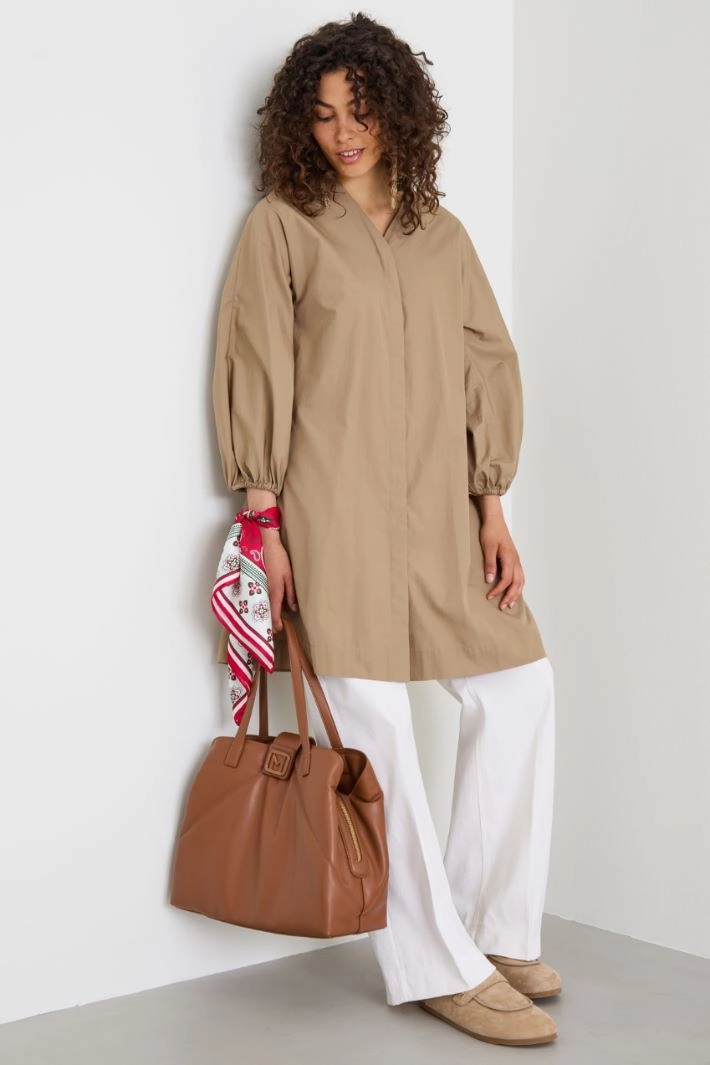 A-line dress in pure cotton poplin, with a V-neck, three-quarter sleeves with elastic and inset side pockets. Fastening with hidden buttons.