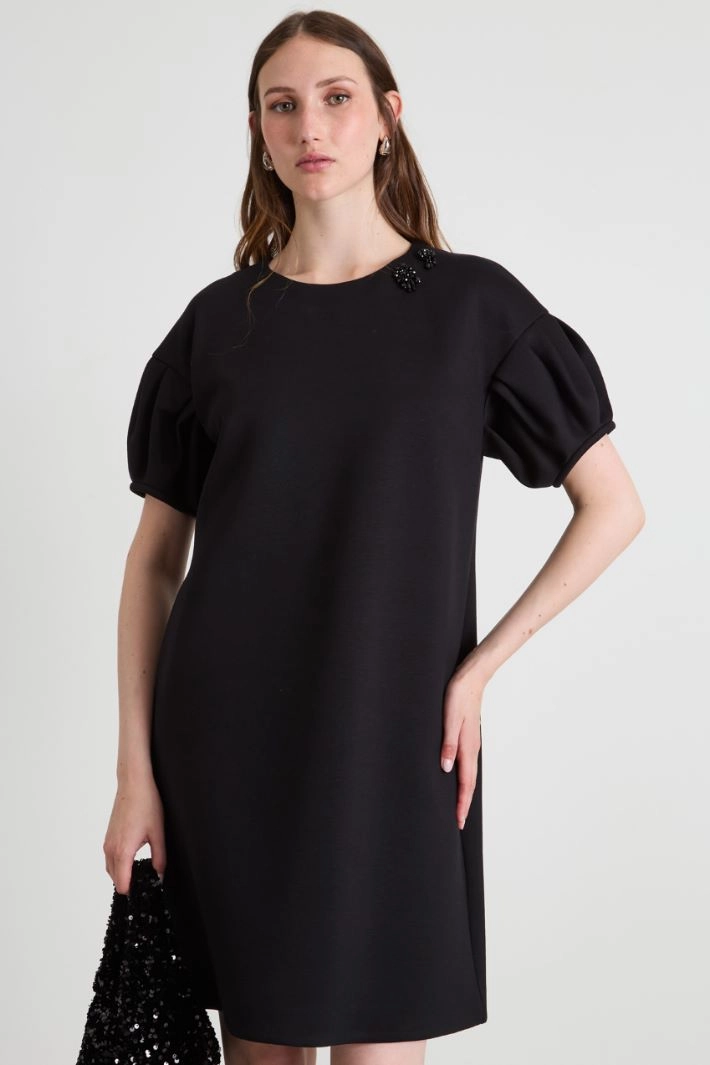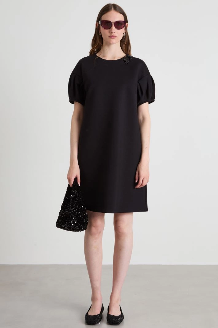 Straight-cut minidress in compact stretch viscose jersey, with a round neckline finished with removable rhinestones, short balloon sleeves and invisible zip fastening on the back.