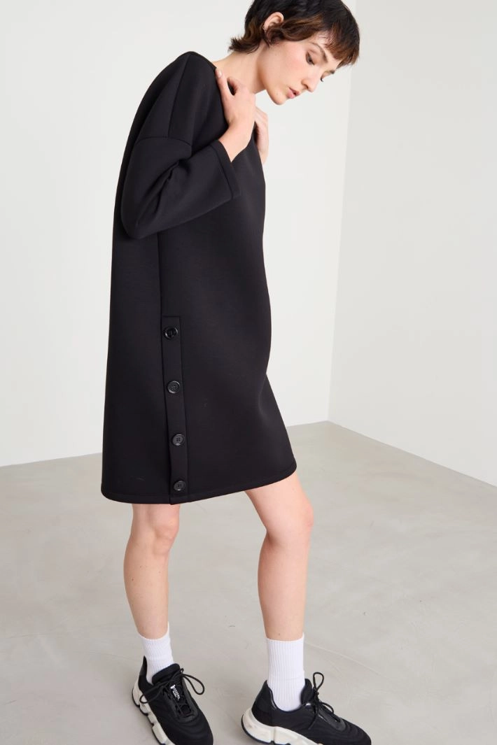 Short, straight-fit dress in compact stretch viscose jersey, with a crew neck, dropped shoulders, three-quarter sleeves and a button opening on the side.